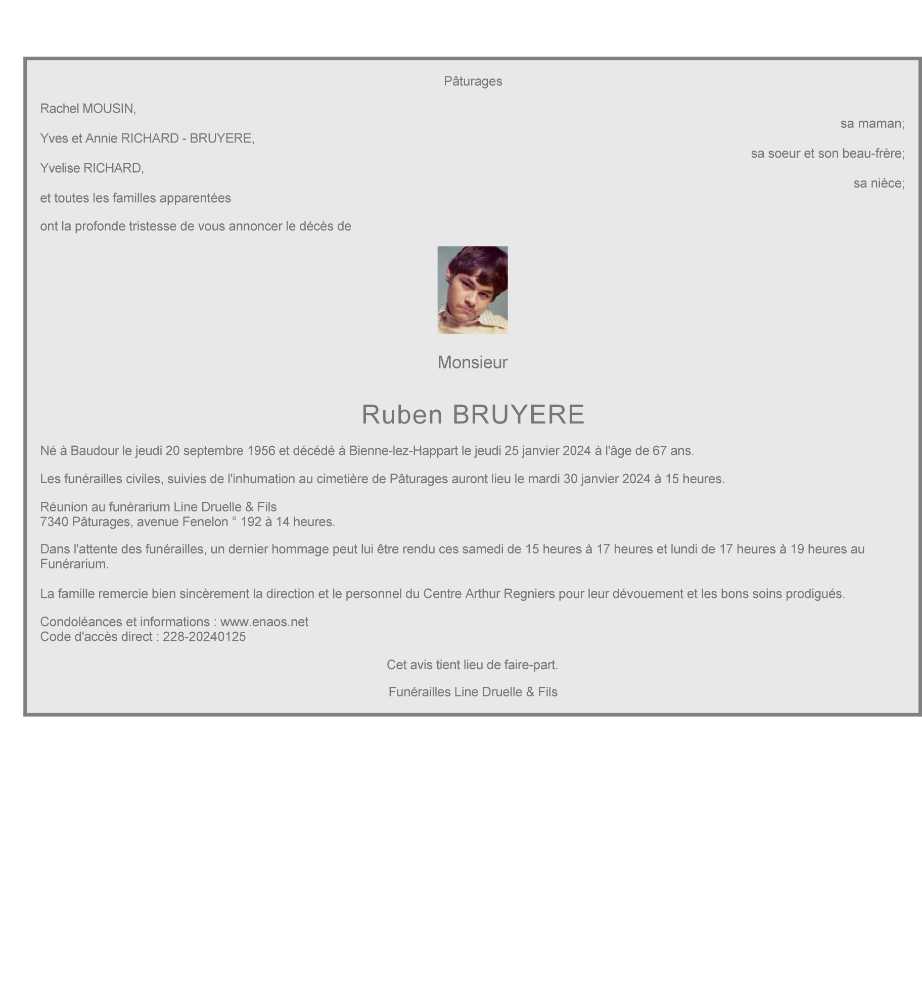 Décédé à Bienne-lez-Happart (6543) le jeudi 25 janvier 2024 à l'âge de 67 ans
